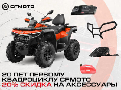 В честь 20-летнего юбилея первого квадроцикла CFMOTO дарит скидку до 20% на все оригинальные аксессуары и дополнительное оборудование* при покупке любых моделей новых квадроциклов ATV и мотовездеходов Side-by-Side CFMOTO!